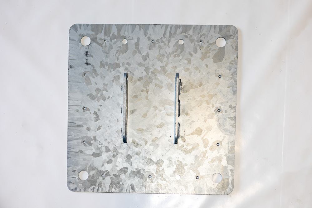 Die Mittelmast-Bodenplatte von Eurostretch ist eine einzigartige Lösung zur Stabilisierung des Mastes in einem Stretchzelt. Im Gegensatz zu herkömmlichen Fußplatten besteht diese Bodenplatte aus zwei separaten Teilen, die sich einfach unter den Mast schieben lassen. So kann die Bodenplatte sogar installiert werden, wenn das Zelt bereits vollständig aufgebaut ist – ganz ohne den Mast zu bewegen oder anzuheben!