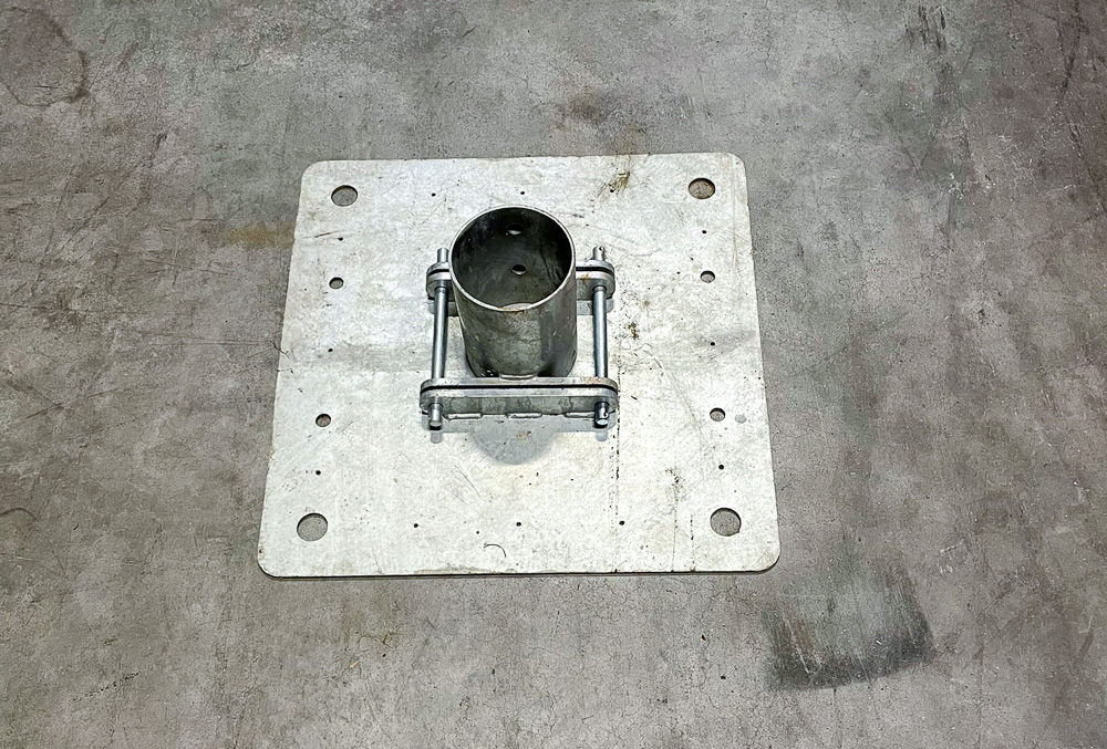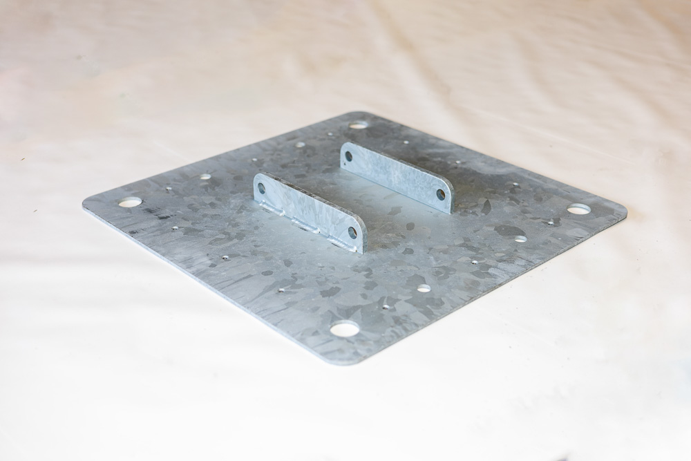Unsere Bodenplatte für den Mittelmast ist eine innovative Lösung, die speziell von Eurostretch entwickelt wurde, um die Stabilisierung des Mastes noch einfacher zu machen. Dank des cleveren zweiteiligen Designs lässt sich die Bodenplatte einfach montieren, ohne den Mast anheben oder verschieben zu müssen. Das spart Zeit und Aufwand – besonders bei großen Zeltkonstruktionen.